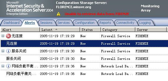 现在,我们把Firenze上的外部链路断开,由于默认情况下连接性验证程序每30秒执行一次,所以等待大约1分钟后,你会发现Firenze上的ISA防火墙服务已经自动停止了,如果在Firenze上的ISA管理控制台的警告中查看,你可以看到触发了以下三个警告,如图所示。
