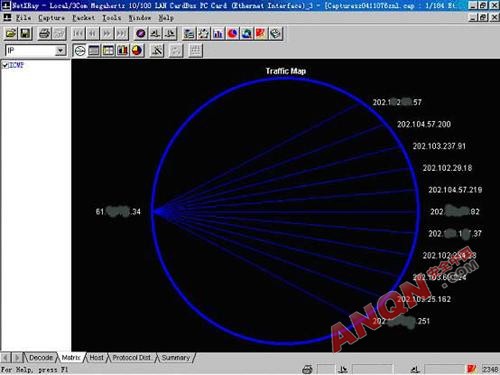 图表说明:此图数据为4月10号下午某数据分局的8010服务器(61.xxx.xxx.34)受攻击时的网络连接图,其中有来自外部IP 202.xxx.xxx.251的连接。