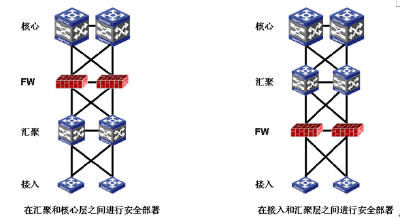 此部署方式会对防火墙的接口类型、协议处理有较高要求。例如,当组网为汇聚和核心采用万兆链路并在汇聚和核心之间采用MPLS VPN组网的时候,就需要防火墙支持万兆链路并能够参与路由计算和处理MPLS报文。此部署方式会对防火墙的接口数量有较高要求。例如,当组网为接入和汇聚之间采用千兆光链路的时候,需要防火墙有较高的端口密度,并在汇聚层下挂多台防火墙才能满足部署要求,势必造成部署成本过高和管理节点过多的情况。