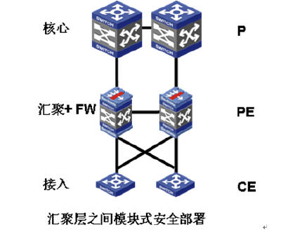 虚拟园区网下采用FW插卡部署,可解决传统部署模式带来的接口类型、协议处理、建设成本和运维管理等一系列的问题。如图8所示为在MPLS VPN环境中,防火墙的部署方式。将一块FW模块插入汇聚层交换机内,由交换机的接口板卡与接入以及核心设备连接,这样就无须考虑防火墙的接口类型等方面的要求;并且保证防火墙的处理在PE和CE之间,可以不必要求防火墙参与OSPF等动态路由协议计算和MPLS报文处理,大大简化了网络设计和运行维护。可见,模块化的安全部署方式在简化设计、降低总拥有成本等方面具有较大优势,是网络设计时需要考虑的常用设计方法之一。