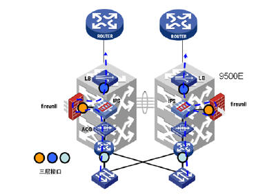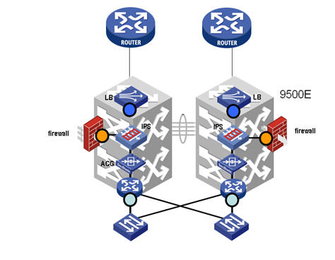 IPS采用主备方式部署,在S9500E上通过MQC引流,转发到主IPS上,当主IPS失效后,通过MQC的下一跳备份功能,流量被引导到备份的IPS上,IPS与ACG部署的位置在S9500E与FW的三层转发路径上,将不会存在上下行不一致的问题。