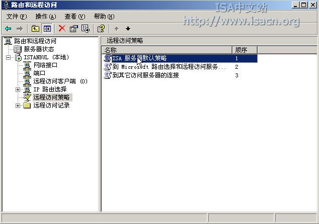 在ISA防火墙启用VPN服务时,会在RRAS的远程访问策略中创建一个名为ISA服务器默认策略的RAP,