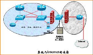例如在区中心与Internet的连接就设置了PIX防火墙,将内网与外网隔断,而作为用户WEB查询用的服务器则置于DMZ (Demilitarized Zoon)中,用户访问时,不会直接进入内网,而只和查询服务器发生关联,再由查询服务器??也只能由查询服务器进入内网寻找到用户所需的数据。这样就可以基本上保证系统的安全性。如下图所示: