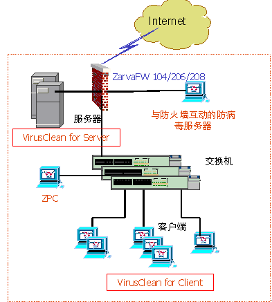 基于朝华软件MAP2DR2的球形网络安全理论,由朝华防火墙和朝华安博士防病毒系统组成的网络安全解决方案,完全切合中小组织用户的网络安全需求,可以帮助他们实现网络体系安全建设目标。典型的网络安全体系拓扑如下图所示: