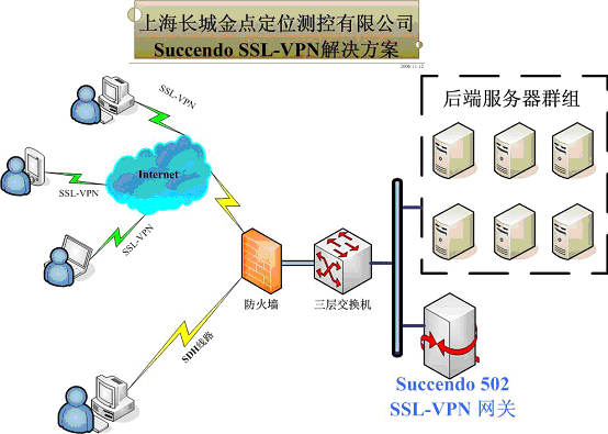针对公司的应用现状和要求,凹凸科技从可靠性、安全性以及易于管理的角度进行了分析,为公司首先部署了一台Succendoreg; 502 SSL-VPN网关,为公司的终端服务对象提供安全可靠的VPN远程接入服务。该网关设备配置在公司防火墙后面,采用旁路方式与后端服务器群组连接(如下图所示)。除了支持常规的Web、FTP、VNC等应用外,它对客户特有的CCP应用也提供了完美的支持。