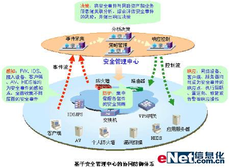 现有安全防御体系面临的问题不是单一的安全部件能够独立解决的。网络信息安全的“木桶原则”表明:一个木桶能装多少水不仅取决于短木板的长度,也取决于木板间的紧密程度;一个网络的安全不仅依赖于单个安全部件的能力,也依赖于各安全部件之间的紧密协作。因此,通过全面、集中的安全管理,智能、综合的事件分析,动态、广泛的协同响应,将不同领域的安全部件融合成一个无缝的安全体系,成为下一代整网安全解决方案的发展趋势。
