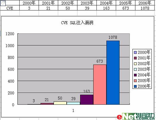 目前有近70%的攻击行为是基于WEB应用,而据CVE的2006年度统计数据显示,SQL注入攻击漏洞呈逐年上升的状态,2006年更是达到了惊人的1078个,而这些还仅限于通用应用程序的漏洞,不包括更为庞大的专业web应用程序所存在的漏洞。