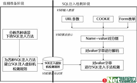其核心内容是首先收集、分析各种可能的SQL注入攻击方法,并提取出相应的有针对性的攻击机理。为这些SQL攻击方法建立SQL注入检测模型,所有的的这些检测虚拟机模型,就叫做VSID算法误用检测模型。根据这些虚拟机检测来自URL\COOKIE\ POST-Form中的各参数域值是否符合SQL注入模型,如果符合则表示发生了SQL注入攻击。