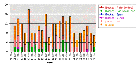 梭子鱼的管理控制台提供完美的可视化统计报告,可以直观地、清晰地看到网络上垃圾邮件情况,下图是该功能的实时截屏。