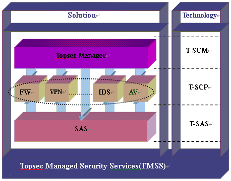 TOPSEC解决方案包括Topsec Manager综合管理系统,各类安全产品,和SAS综合安全审计系统。其中: