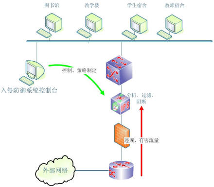 依据启明星辰公司对西北工业大学网络安全建设需求的分析和理解,并结合公司在网络安全解决方案方面的实际经验,启明星辰为西北工业大学提供了基于入侵防御系统的安全解决方案。这一解决方案满足了用户对校园网络系统安全性的期望,能够顺畅地随业务的增长而扩充。其拓扑结构如下图所示: