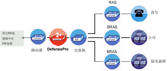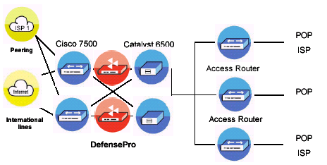 在中央POP位置安装DefensePro后,将可以扫描所有流经国际链路的入站和出站流量。对常见病毒(如红色代码和尼姆达)的过滤有助于通讯商节省国际骨干网的容量。比如,仅此一项就为韩国的Hanaro Telecom节省了将近20% 的国际骨干网容量。