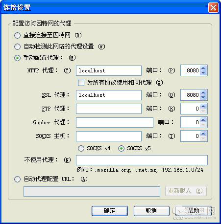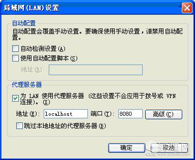 3、选择“手动配置代理”,并为HTTP代理和SSL代理指明运行WVS计算机的IP地址和端口号(默认为8080)。