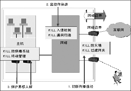 根据IATF的纵深防御理论,我们可以从计算机主机、内部网络和网络边界三个层次分别进行安全控制。我们也发现,以计算机病毒为代表的混合型威胁,完全具备生物病毒的特点:传染性和破坏性。传染源(威胁)通过传播途径(网络、电子邮件等)影响易感人群(计算机系统)。因此,我们可以借助防治病毒三个要素思想进行安全方案设计:在网络边界,切断传播途径;在网络范围,监控传染源;对计算机系统,保护易感人群。