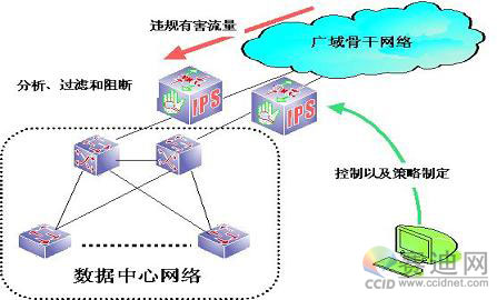 首先,清晰化网络边界,物理上区别开数据中心网络与其他网络,建立起边界明晰的安全域。安全域的划分为安全产品的整体效能发挥提供了一个良好的平台,不仅便于安全产品的部署,还为此后引入新IT支撑系统提供了灵活的扩展性,最重要的是为将来的设备集中管理、网络安全产品集中管理奠定了坚实的基础。其次,在数据中心网络边界部署天清入侵防御系统,加强数据中心网络深层入侵威胁防范能力。将入侵防御系统的防御引擎部署在数据中心网络与其他网络(这里主要是广域骨干网络)的边界上,检测、分析和控制那些通过广域骨干网络向数据中心网络的所有网络数据流量,一旦发现有攻击或恶意行为发生,立即给予阻断。