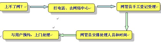 随着校园网用户数的增多,尤其是宿舍网运营的开始,用户网络故障的排除会成为校园网管理工作的重点和难点,传统的网络故障解决方式主要是这样一个流程: