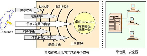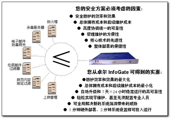 卓尔伟业公司推出的全新集成式模块化内容过滤安全网关产品――卓尔InfoGate,专门体贴您的上述各种难处,它既有硬件产品的高可靠性和高效率,又有软件产品的高度灵活性和可扩充性,效果、效率、价格、功能等本来相互矛盾的制约因素在卓尔InfoGate产品上得到了高度的统一,其独创的安全协同技术和自主研发能力使得卓尔InfoGate完全不同于一般概念上的安全产品,它不仅仅是防火墙、病毒过滤、垃圾邮件过滤、网页内容地址过滤、泄密防范、VPN等产品和技术的简单相加,由于采用了独创的安全协同技术进行了高度有机整合,各种功能模块共享软硬件资源,可在有效降低成本的同时,实现功能上的强强联手,能够在企业Internet入口处全面阻止病毒、垃圾邮件的入侵,全面监管Web访问和邮件通讯,使各种安全威胁在进入内部网络之前就被全方位地得到及时有效的扑杀,快速、实时、高效、透明地实现对内部网络的综合防护。