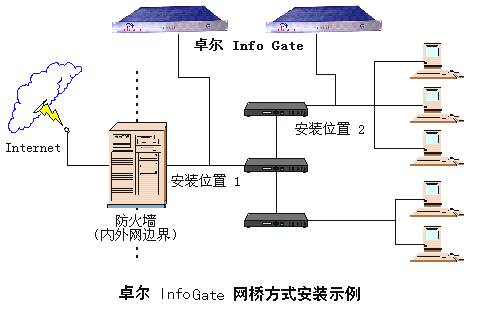采用网桥能够将卓尔InfoGate产品实施于很多位置,如网关处于防火墙或路由器后、或者在子网和主干网络的连接处等。网桥结构的卓尔InfoGate产品在实施时不需要改变任何的网络结构,也不需要改变任何桌面PC的网络设置。