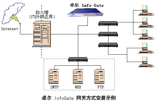 对于需要网关防护的企业,在实施卓尔InfoGate产品时可以使用网关结构,因为网关结构的卓尔InfoGate产品具有基本的地址转换、访问控制等网关防护功能。采用网关结构的卓尔InfoGate产品能够在Internet连接处建立起应用层的过滤网关。