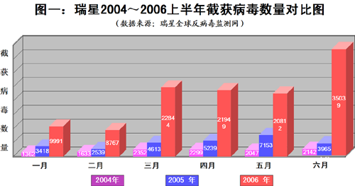 2004年上半年,瑞星截获新病毒11835个,2005年同期,新病毒数为26927个,而今年上半年,新截获的病毒数量飙升到了119402个,相当于过去几年截获病毒数量的总和。在今年病毒较为泛滥的时期,一天内截获的新病毒比2005年一个月截获的病毒还要多。
