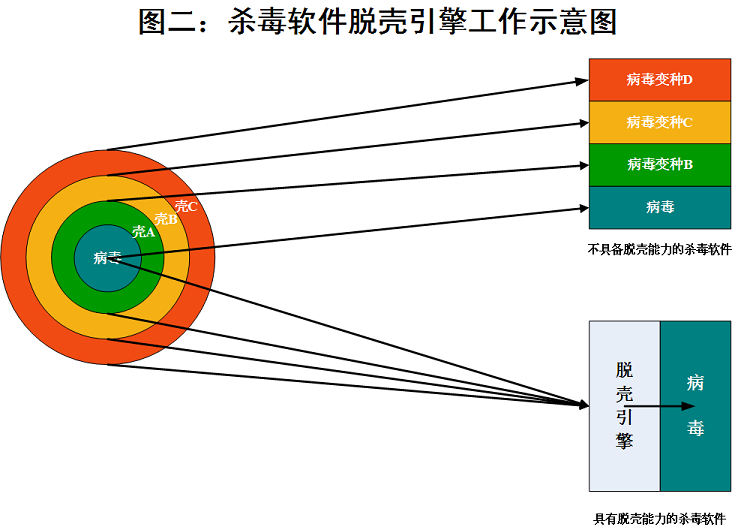 由于目前大多数病毒都会采用“加壳”的手段进行自我保护,因此需要杀毒软件具有“脱壳”能力。脱壳引擎通过一些算法将“加壳加密”的病毒还原成原始状态,再对其原始状态进行查毒。