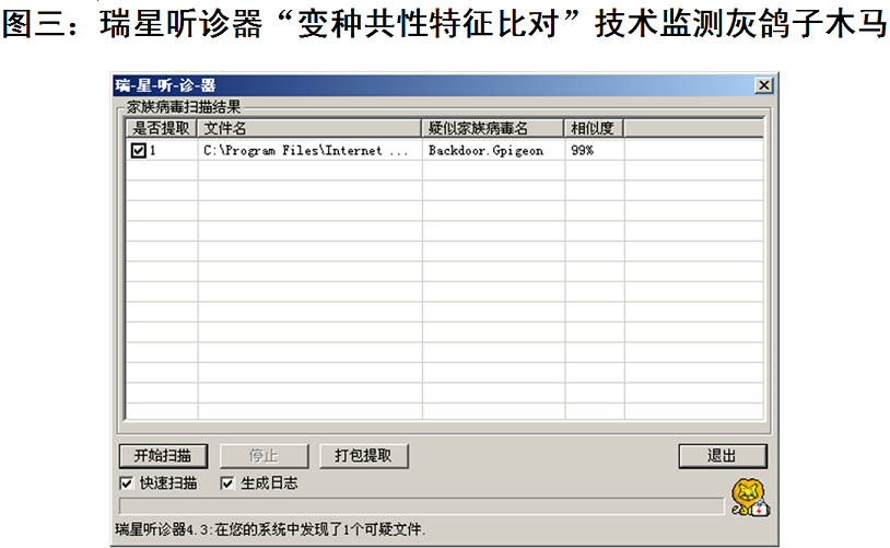 “变种共性特征比对”技术是瑞星独家研发的一种新的广谱查毒技术,它与Generic技术存在相似之处,也是对大量病毒样本进行特征分析,提取相同的特征。但是“变种共性特征比对”具有更强的抗“免杀”能力和智能判断能力。往往,黑客用技术手段能够绕开Generic技术的查杀,却不能逃脱“变种共性特征比对”技术的检测。同时“变种共性特征比对”还可以报告出病毒变种与该病毒家族的相似程度,查毒结果更为精确。目前,“变种共性特征比对”技术已经全面应用于“瑞星听诊器 4.3版”及以上版本当中,对“灰鸽子(Backdoor.Gpigeon)”等木马的变种识别率能够达到九成以上。
