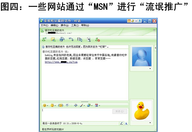 今年6月初,许多MSN的用户都遇到被陌生人恶意添加为好友的情况,被添加之后对方并不与自己聊天,而是发送一段网址或是广告,根据有关媒体调查,90%以上的MSN用户都被一家名为“中国缘”的网站骚扰过,该网站面对媒体的不断暴光依然我行我素,继续采用MSN添加好友发广告的方式推广。