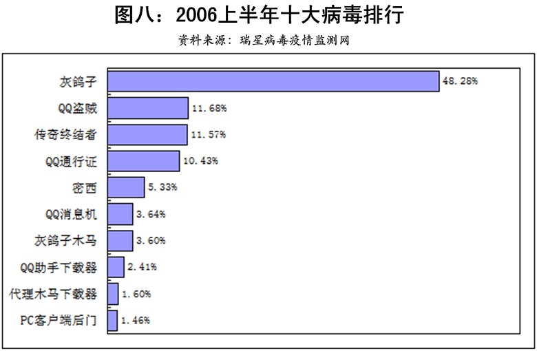 此外,2006年上半年“流氓软件”问题仍然严重。据瑞星病毒疫情监测网统计结果显示,从1月到6月感染机器台数最多的并不是病毒,而是流氓软件。上半年出现了几个比较恶劣的流氓软件,均是由正规厂商制作。这些软件运行后会定期或随机地释放(或从互联网下载)广告程序、其它的下载器。这些广告程序或下载器带有明显的木马特征,流氓软件和病毒之间的界限已经越来越模糊。