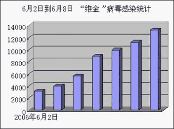6月2日,金山毒霸反病毒监测中心截获“维金(Worm.Viking.m,又名:威金)”病毒。截止当日下午三时,已经有至少3000位以上的用户计算机受到该病毒的破坏,截至6月8日16时,受攻击个人用户已由3000多迅速上升到13647人,数十家企业用户网络瘫痪。