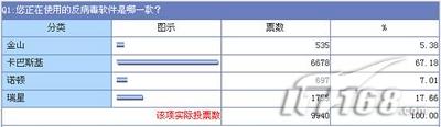 在这次关于“您正在使用的反病毒软件是哪一款?”的调查中我们并没有选择全部的反病毒的品牌进行对比,仅就金山、卡巴斯基、诺顿、瑞星四款产品。该样品总数9940票,卡巴斯基以67.18%的比率占据第一,瑞星占据第二。这与卡巴斯基在2006年的极大推广和宣传是分不开的,尤其是其在 360安全卫士上的免费使用,拥有更多的忠实用户,而瑞星和金山在2006年也进军了海外领域,并且取得了骄人的成绩,但是未能及时抓住反流氓软件斗争这一主题也可以说是2006年国内杀毒软件的失败,错失了品牌推广的良机。