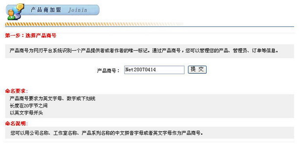 这里有一点要说明的就是在注册的第一步首先要选择一个产品商号,该号是您作为一个产品提供者的唯一标识,命名规则要求以英文、数字、下划线所构成并且必须要以英文字母开头。