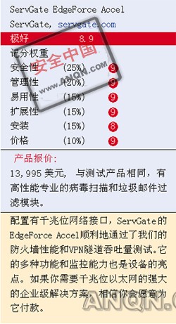 EdgeForce Accel是一个1U的机架安装产品,采用了一种经过定制的Linux操作系统,运行在一台奔腾III 866MHz上,并且系统采用了Broadcom的安全芯片来进行密钥计算。这是参测设备中惟一的一款国际计算机安全协会认证过的产品,支持千兆网络接口。该设备采用了图形用户界面的标准管理系统,其防火墙规则设置或者e-mail报警设置都非常简单。Accel支持多种VPN标准和协议,您可以根据需要设置所需的QoS。对于管理多个分支机构中的防火墙也会非常简单,ServGate会很快发布一款集中管理控制台软件。