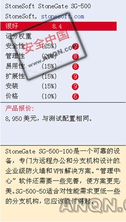 如果您正在寻找一款适合远程办公的可管理的防火墙的话,StoneGate的基于Linux的SG-500无疑是这一组产品中比较好的一个选择。尽管SG-500没有内容过滤、防病毒等功能,但它为远程配置多种设备提供了一个中央服务器。我们测试的StoneGate SG-500-100,其防火墙吞吐率达100Mbps;而价格较低的SG-500-50吞吐率也可达50Mbps 。