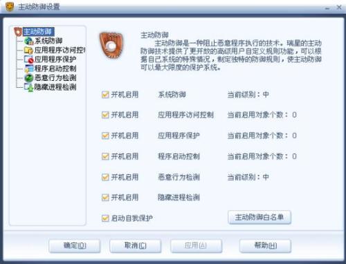 主动防御应该是瑞星2008的最大亮点, 包含“系统防御”、“应用程序访问控制”、“应用程序保护”、“程序启动控制”、“恶意行为检测”和“隐藏进程检测”等几大功能。