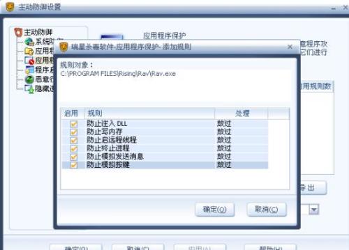应用程序访问控制、应用程序保护和程序启动控制这几项可以由用户自定义大量的规则,非常方便高级用户使用。而对于一些新爆发的病毒,通过简单的规则设置,也可以快速的将其阻止。比如,在应用程序保护中,用户可以指定要保护的程序,并且可以指定规则,比如“防止注入DLL”、“防止写内存”等等。