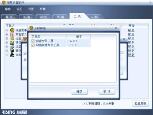 以往安全厂商发布了安全工具或者专杀工具后,用户都要登录其网站进行下载才能使用。而瑞星08提供了一个集成的安全工具管理平台,用户只需要点上面的“检查更新”按钮就可以立即下载到最新的工具。