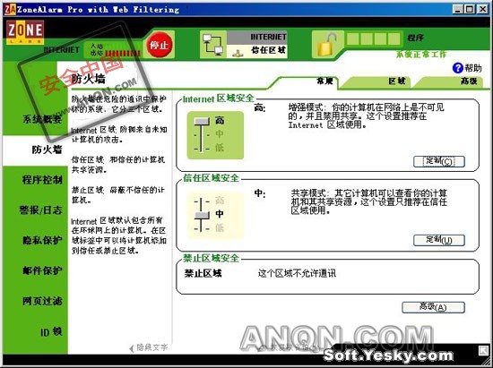 在ZoneAlarm中单击“防火墙”标签,我们可以看到ZoneAlarm将用户的网络连接安全区域分为三类:Internet区域、可信任区域和禁止区域。通过调整滑块可以方便的改变各个区域安全级别,当设置为最高时,你的计算机将在网络上不可见,并禁止一切共享。