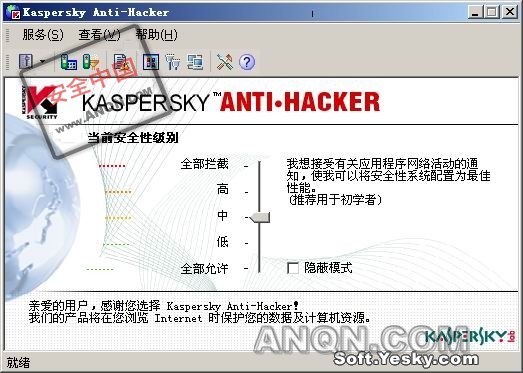 先安装英文原程序,再运行汉化包对软件进行汉化。重启后自动运行,单击托盘中的图标打开程序。在窗口中显示的是当前的安全级别,Kaspersky Anti-Hacker把网络安全共分别五个级别,一般用户选择默认级别“中”即可。