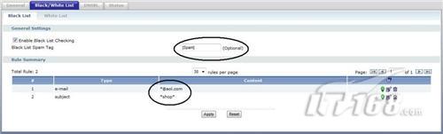 在USG100中,用户可以根据电子邮件地址、IP地址或电子邮件主题或邮件头信息等来设置白名单和黑名单规则,从而过滤电子邮件。另外用户可以使用通配符“*”来创建规则。