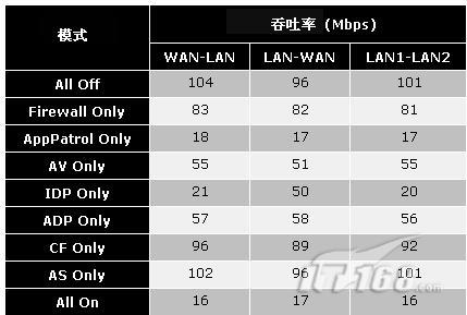 根据我对同时启用几种不同功能情况下的吞吐能力测试,在同时启用几种不同功能的情况下,整体的吞吐能力由吞吐能力最低的功能来决定。举个例子来说,当我启用了反病毒、防火墙和内容过滤功能的时候,其吞吐能力大约为49Mbps,略低于单独启用反病毒功能时的吞吐能力。