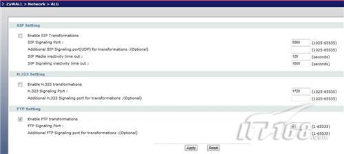 USG100具有两个网络应用管理功能。第一个是应用层网关(ALG)功能,在管理VOIP和FTP应用方面非常有用。网络地址转换(NAT)可以导致VOIP和FTP应用中的安全和连接问题,在某些情况下,通过使用应用层网关功能,可以有效的减少此类问题的发生。如图10所示,在USG100中应用层网关可以支持SIP、H.323和FTP等服务协议。