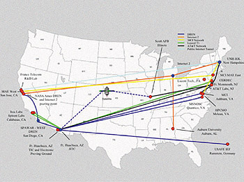 测试组通过对DHCP部分内容的测试,搞清了下一步该做什么,这是十分重要的,因为如果要让IPv6被广泛采纳的话,DHCP和域名系统必须比在IPv4中工作得更好。测试组还完成了首次VoIP over IPv6广域网(WAN)测试,成功地从UNH大学向某设备商在韩国的机构打通了电话。虽然话音质量不是最好,但重要的是验证了通话功能。VoIP的实现有利于在美国推动IPv6的实施。图1是MoonV6的试验床网络。