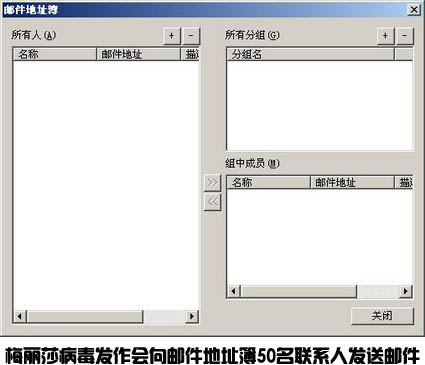 梅利莎(1999年)是通过微软的Outlook电子邮件软件,向用户通讯簿名单中的50位联系人发送邮件来传播自身。该邮件包含以下这句话:“这就是你请求的文档,不要给别人看”,此外夹带一个Word文档附件。而单击这个文件,就会使病毒感染主机并且重复自我复制。