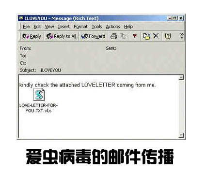爱虫(2000年)是通过Outlook电子邮件系统传播,邮件主题为“I Love You”,包含附件“Love-Letter-for-you.txt.vbs”。打开病毒附件后,该病毒会自动向通讯簿中的所有电子邮件地址发送病毒邮件副本,阻塞邮件服务器,同时还感染扩展名为.VBS、.HTA、.JPG、.MP3等十二种数据文件。