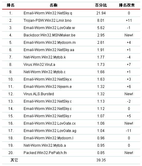2008年2月中国地区流行的前二十名通过电子邮件传播的恶意程序如下: