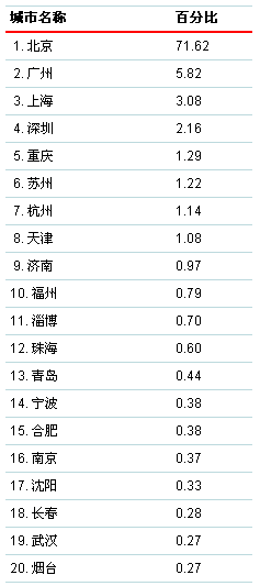 另一个报告是中国地区的城市感染情况排名。北京占据排行榜首位并不令我们感到惊讶,但是北京占了将近3/4的比例确实值得关注。其它城市的比例则远远小于首都北京: