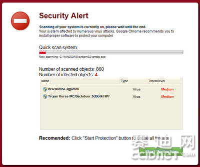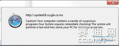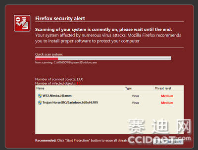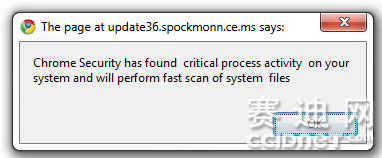 例如,在Firefox下遇到这种流氓软件,弹出的会是Firefox风格的对话框,而Chrome和Safari访问时也会有相应的“安全警告”出现,例如告知用户浏览器安全机制已经发现系统异动,并在扫描系统文件等等,如图: