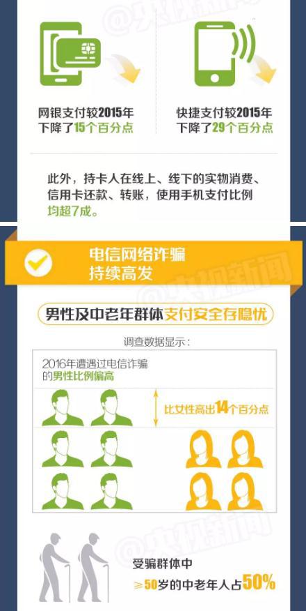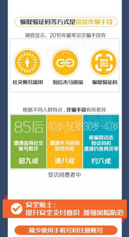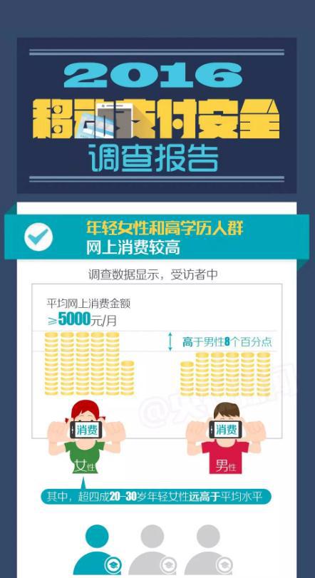 日前中国银联发布了2016移动支付安全调查报告。数据显示,年轻姑娘们更喜欢网上买买买,超过四成的20-30岁年轻女性月均消费超过5000,远高于平均水平;数据还显示,男性比女性更容易遭遇网络诈骗,2016年遭遇过电信诈骗的男性比女性高出14个百分点。最新的诈骗手段有哪些,又该如何防范呢?