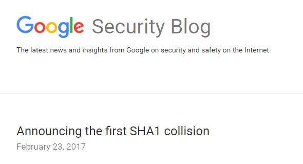 9,223,372,036,854,775,808 次演算之后,Google和荷兰CWI的研究者完成了对SHA-1哈希算法的破解:他们创造了两个内容截然不同,SHA-1哈希值却完全一致的PDF文件。此事件给已经日渐黄昏的SHA-1算法又补了一刀。
