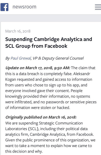 最近,Facebook暂停了CA在其社交媒体平台购买广告和管理页面的权限,并解释了Facebook是如何“上当受骗”的,算是对上面的问题做出了回应——用户的数据确实被拿走了,而且可能确实是被用于政治目的。